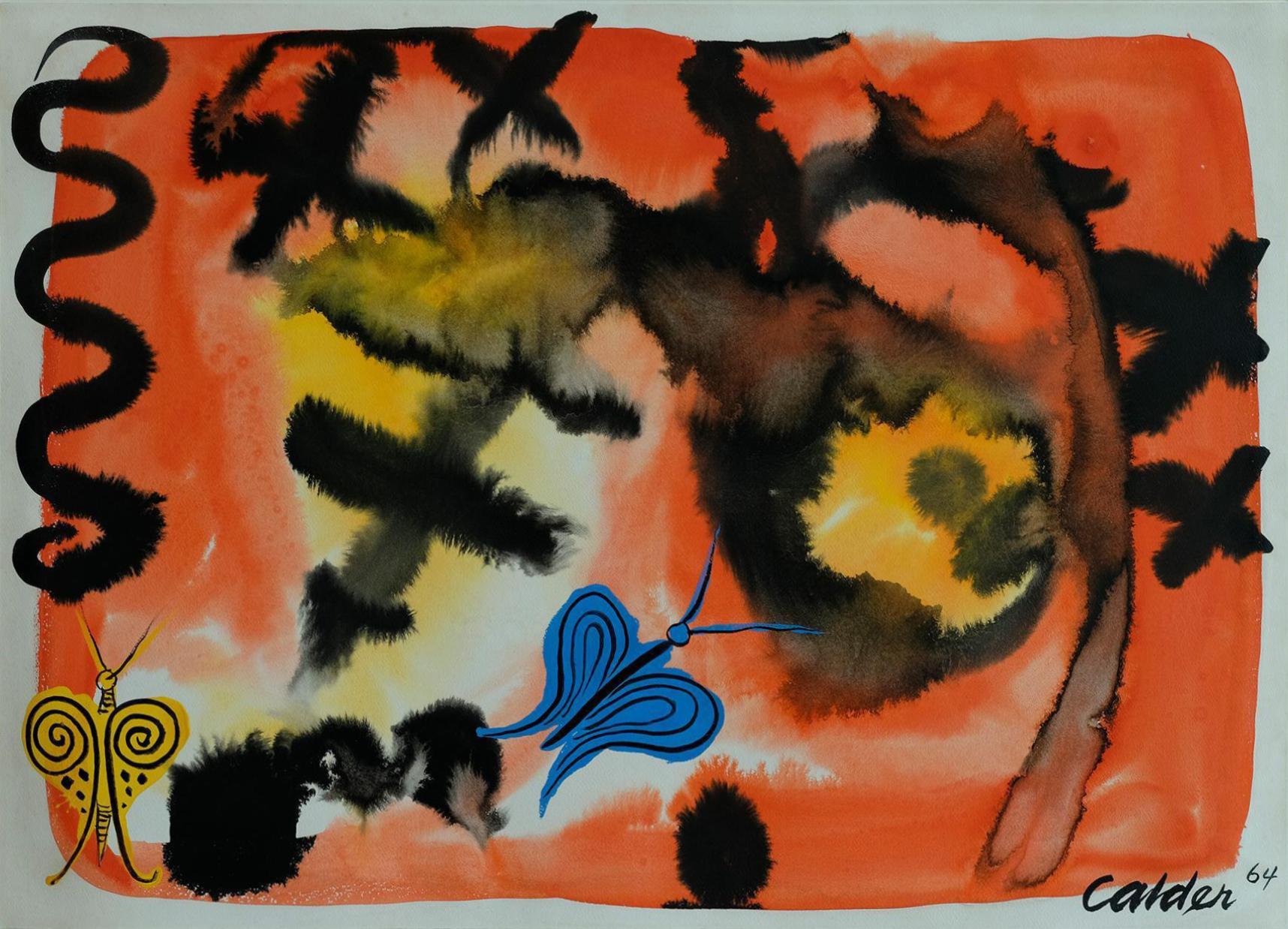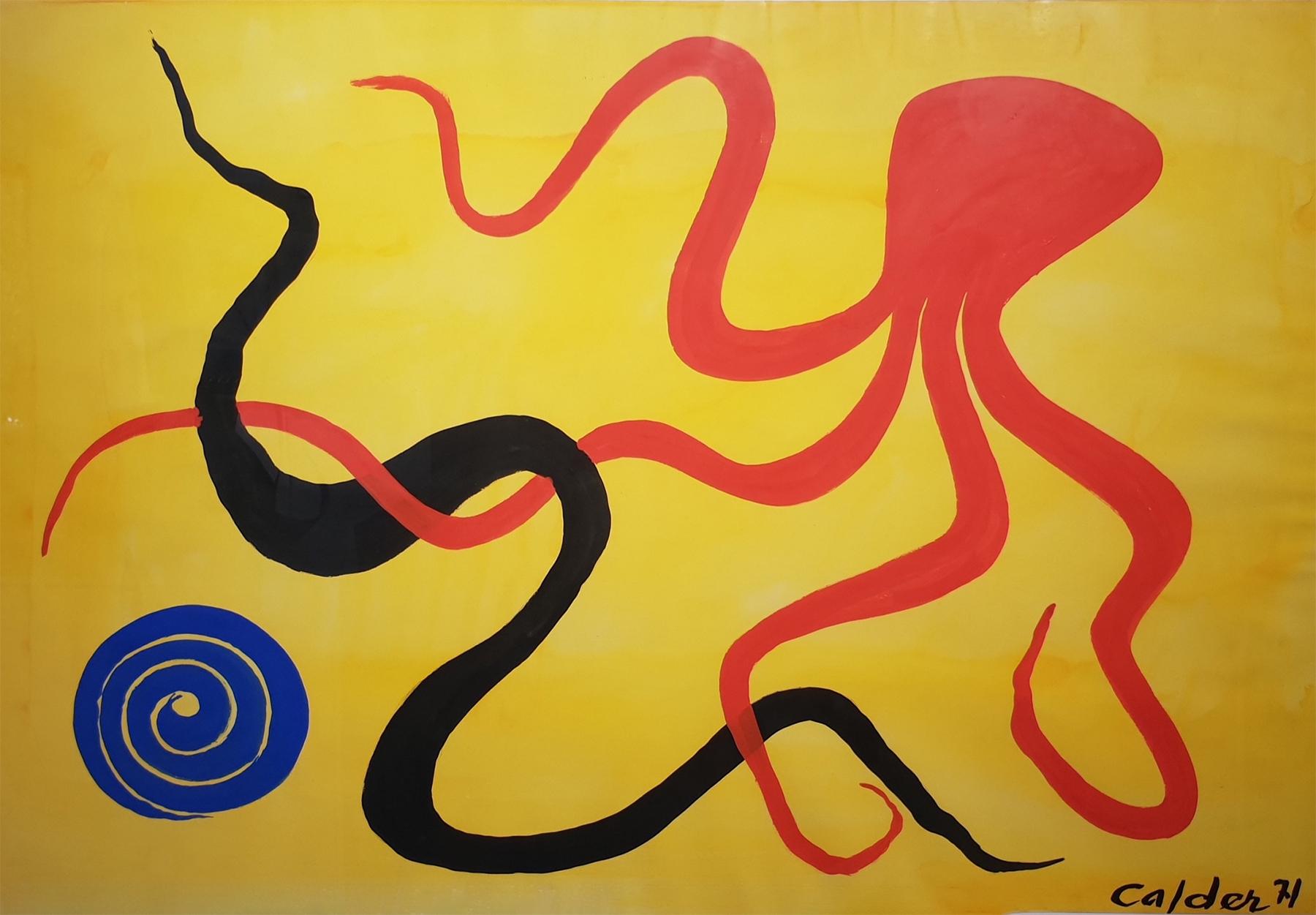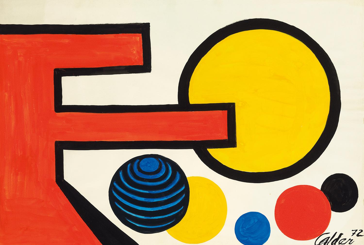 In addition to his circus-inspired work, Alexander Calder sculpted wire portraits of friends and public figures. His inventive artistry gained attention, and in 1928, he had his first solo gallery show at the Weyhe Gallery in New York. Numerous exhibitions in New York, Paris, and Berlin soon followed, leading to frequent travels across the ocean - during which he met Louisa James, who he married in January 1931. During his time in Paris, Calder met other influential artists and intellectuals, including Joan Miró, Fernand Léger, James Johnson Sweeney, Marcel Duchamp, and Piet Mondrian. A visit to the latter’s studio in 1930, where he was impressed by the studio environment, had a profound impact on Calder, pushing him toward creating abstract paintings. He soon shifted his focus from painting to sculpture, finding that he preferred sculpture to painting. He created his first truly kinetic sculpture in 1931, giving birth to a new form of art that were named "mobiles" by Duchamp. These early mobiles were often motorised, but Calder realised he could create sculptures that undulated on their own with the air's currents. To differentiate his stationary abstract sculptures, artist Jean Arp coined the term "stabiles" for Calder's non-kinetic works. Despite his preference for sculptures, Calder never ceased painting and drawing. He enjoyed working with gouache, which allowed for spontaneous expression. His works on canvas and paper blurred the boundaries between presence and absence, often with gestural undertones.