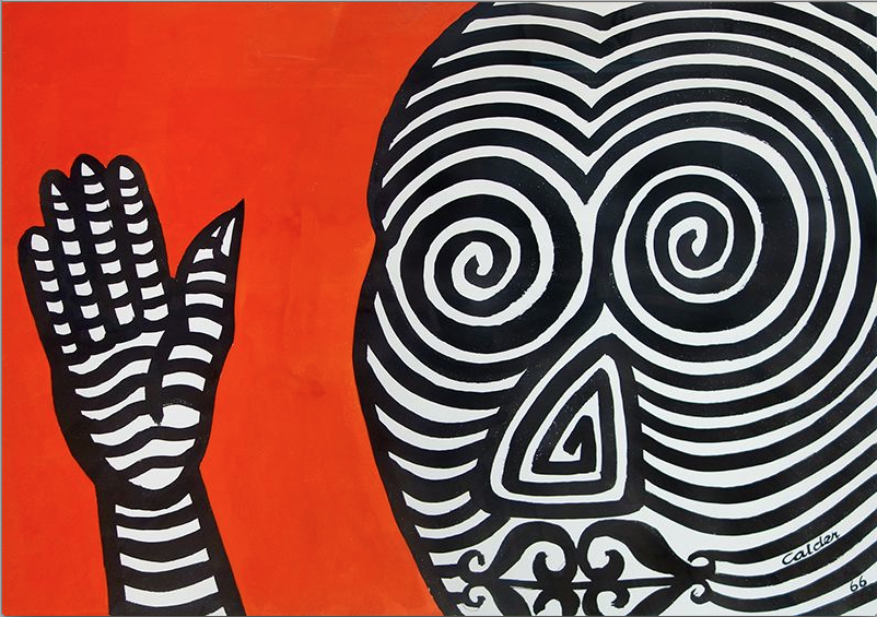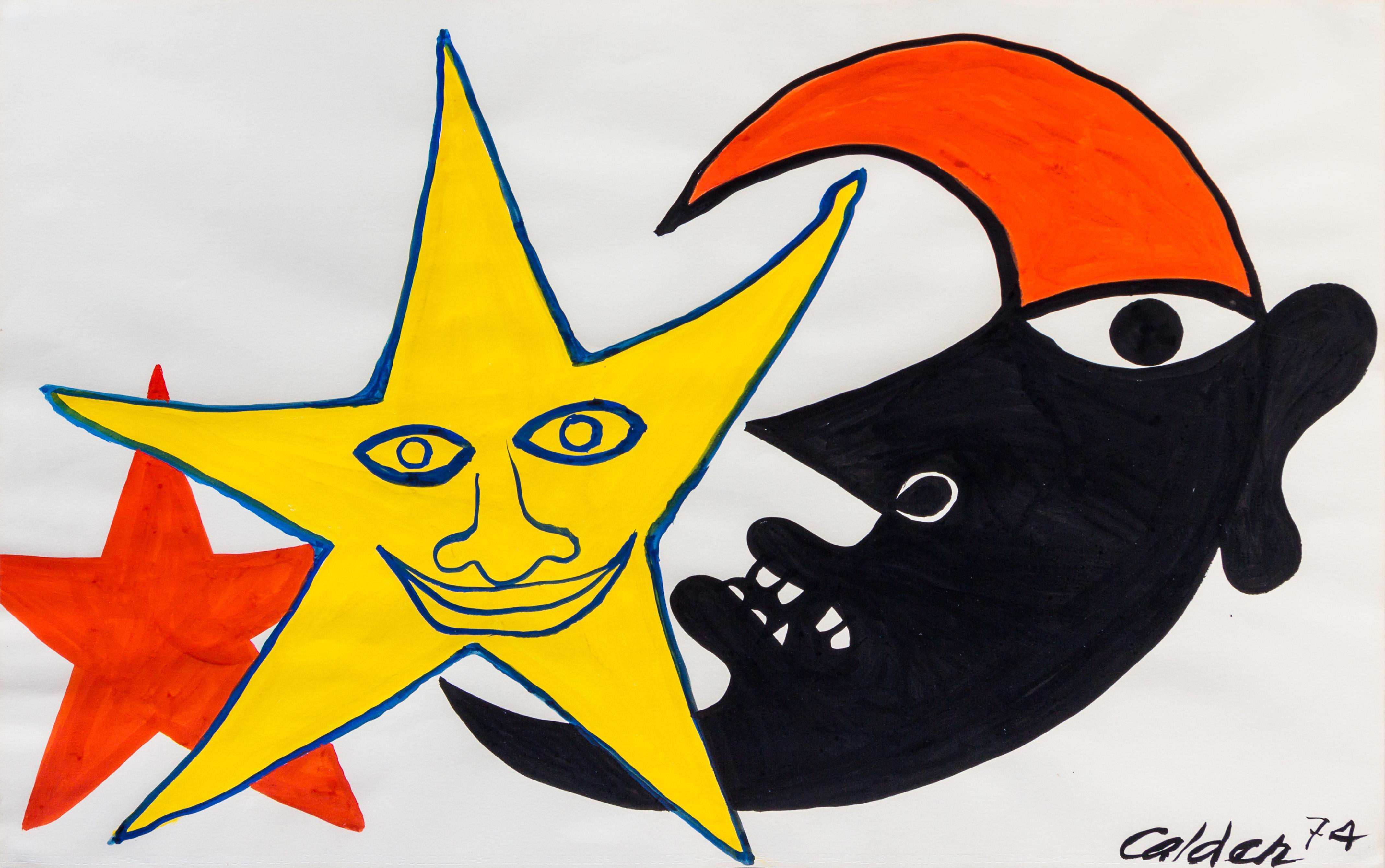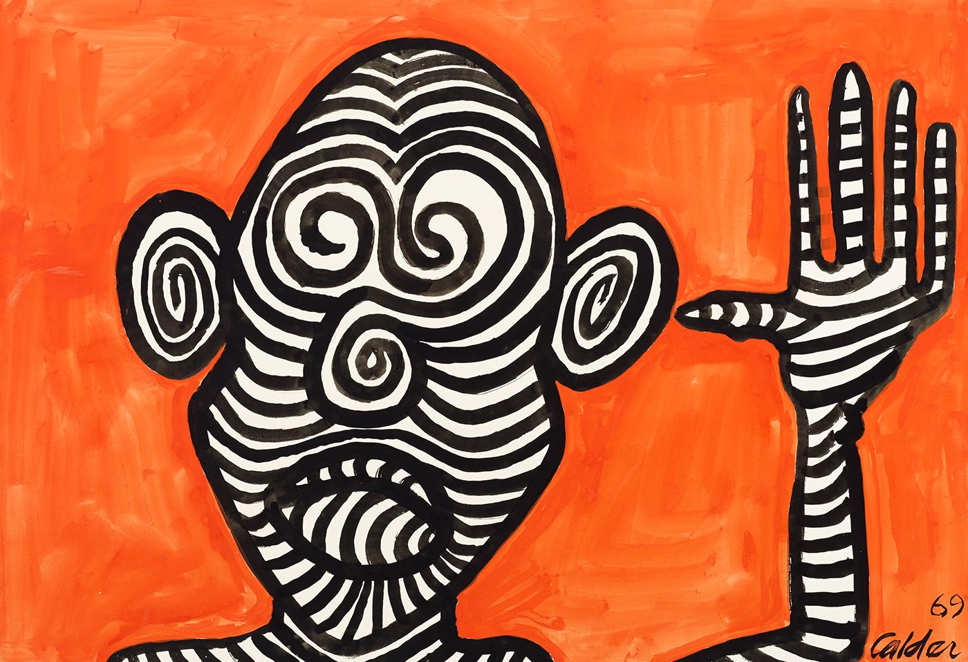 In addition to his circus-inspired work, Alexander Calder sculpted wire portraits of friends and public figures. His inventive artistry gained attention, and in 1928, he had his first solo gallery show at the Weyhe Gallery in New York. Numerous exhibitions in New York, Paris, and Berlin soon followed, leading to frequent travels across the ocean - during which he met Louisa James, who he married in January 1931. During his time in Paris, Calder met other influential artists and intellectuals, including Joan Miró, Fernand Léger, James Johnson Sweeney, Marcel Duchamp, and Piet Mondrian. A visit to the latter’s studio in 1930, where he was impressed by the studio environment, had a profound impact on Calder, pushing him toward creating abstract paintings. He soon shifted his focus from painting to sculpture, finding that he preferred sculpture to painting. He created his first truly kinetic sculpture in 1931, giving birth to a new form of art that were named "mobiles" by Duchamp. These early mobiles were often motorised, but Calder realised he could create sculptures that undulated on their own with the air's currents. To differentiate his stationary abstract sculptures, artist Jean Arp coined the term "stabiles" for Calder's non-kinetic works. Despite his preference for sculptures, Calder never ceased painting and drawing. He enjoyed working with gouache, which allowed for spontaneous expression. His works on canvas and paper blurred the boundaries between presence and absence, often with gestural undertones.