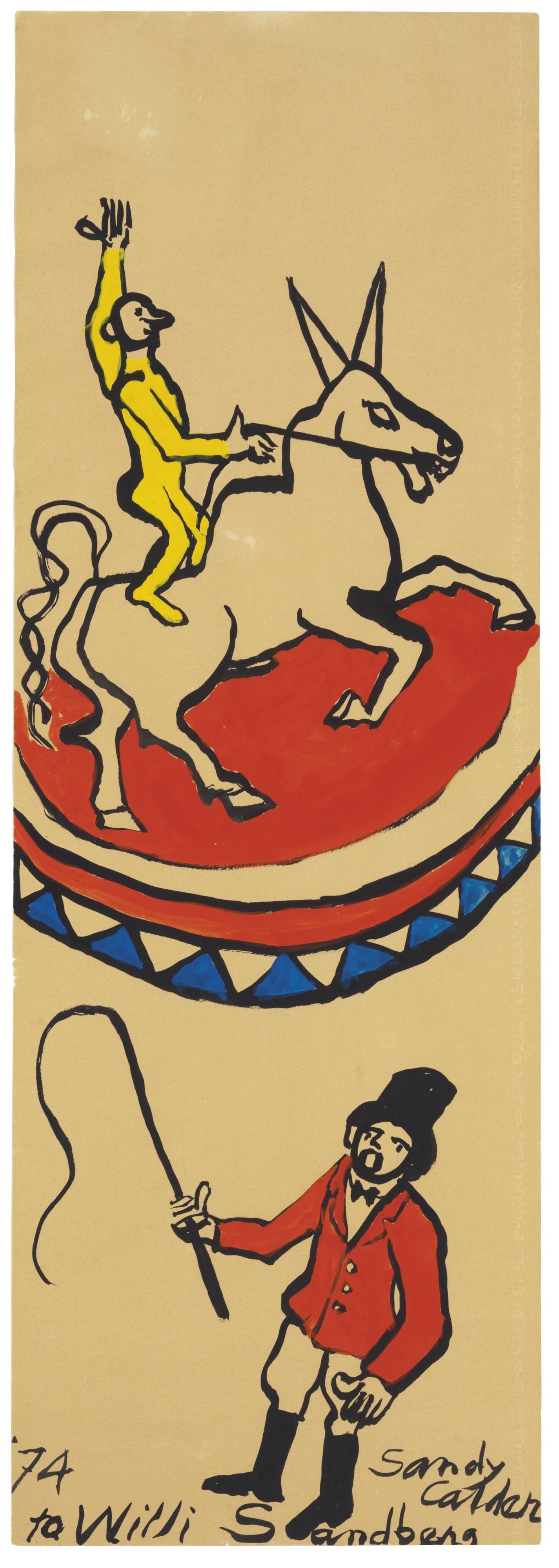 Calder enrolled at the Art Students League in 1923, when he moved to New York. During this time, he worked as an illustrator for the National Police Gazette and had the opportunity to sketch circus scenes at the Ringling Bros. and Barnum & Bailey Circus. The circus became a lifelong interest for Calder, and after relocating to Paris in 1926, he created his renowned Cirque Calder, a unique body of art including acrobats, animals, and props made of wire and a spectrum of found materials. Cirque Calder, predating the concept of performance art by forty years, was designed to be manually manipulated by Calder and could be packed into five suitcases for performances anywhere.