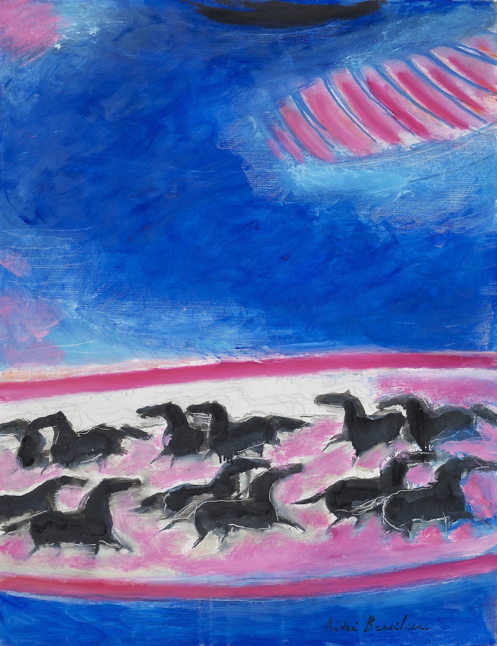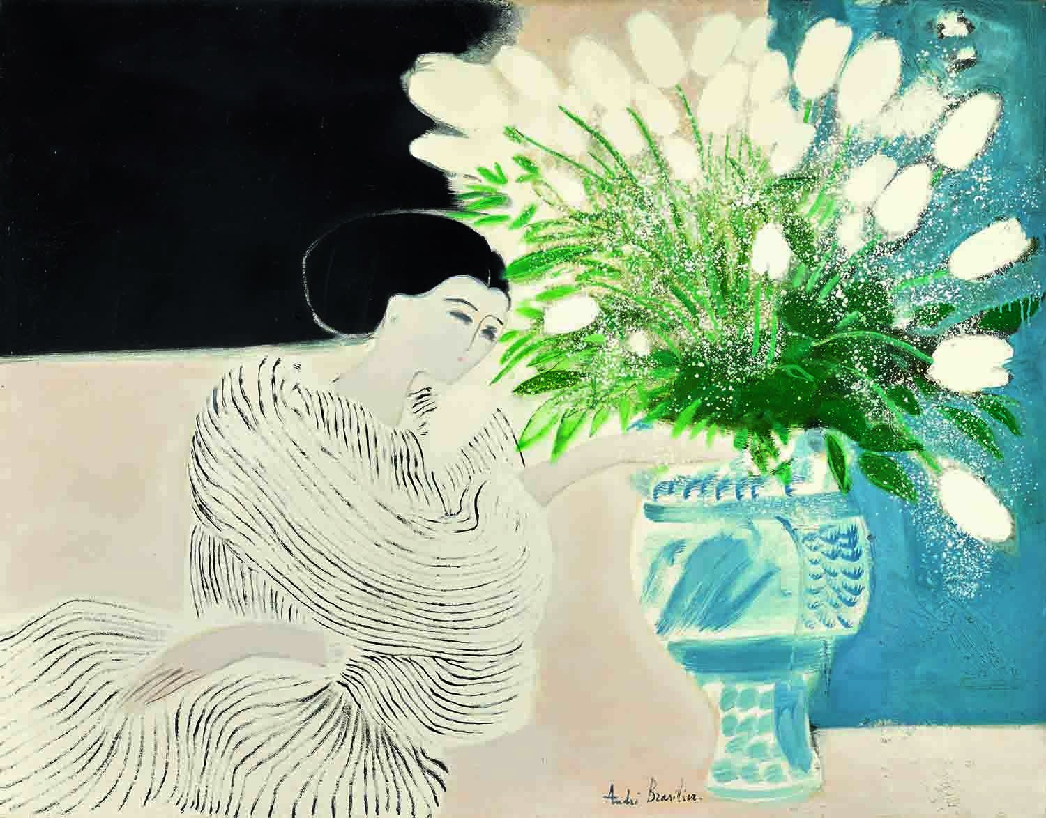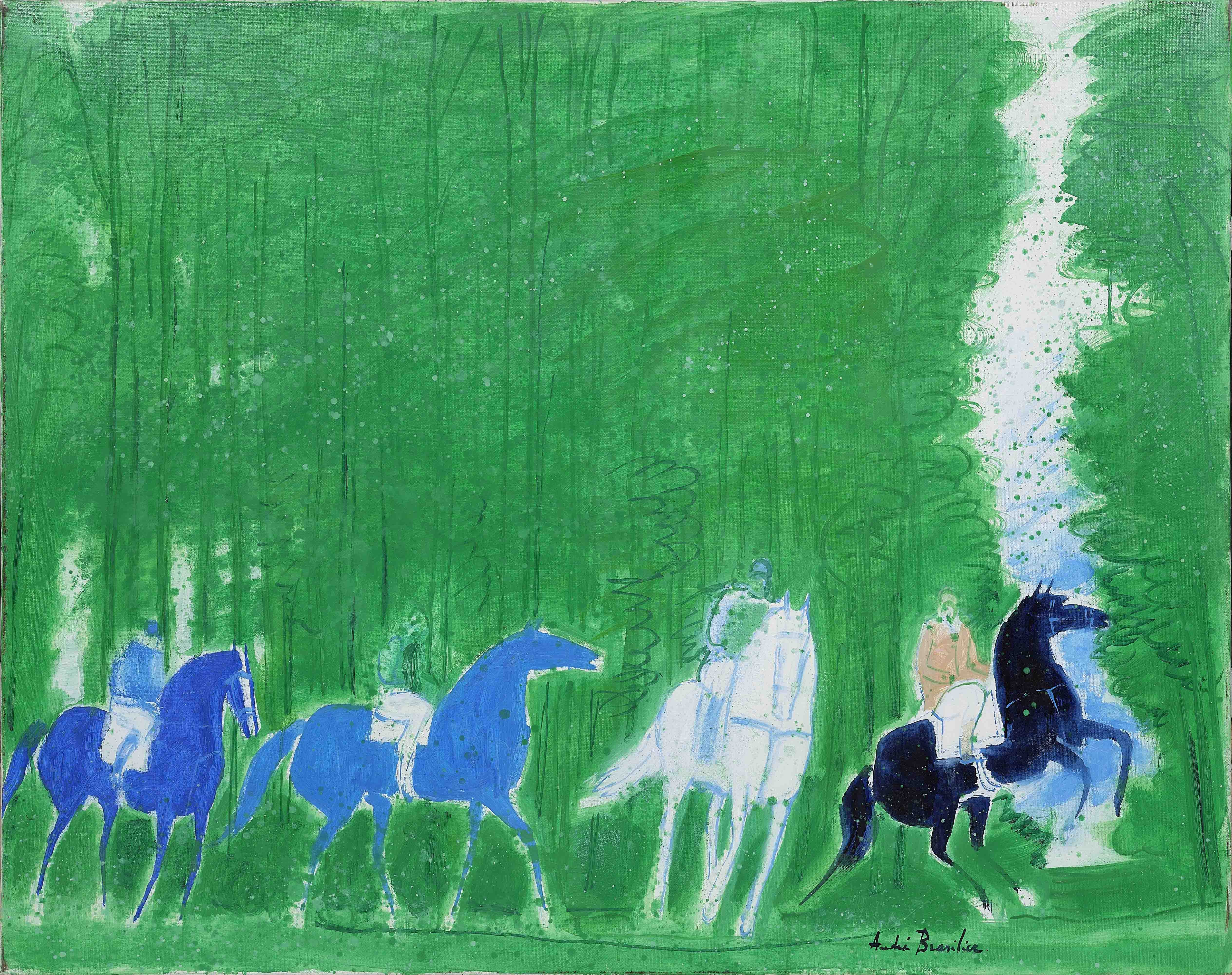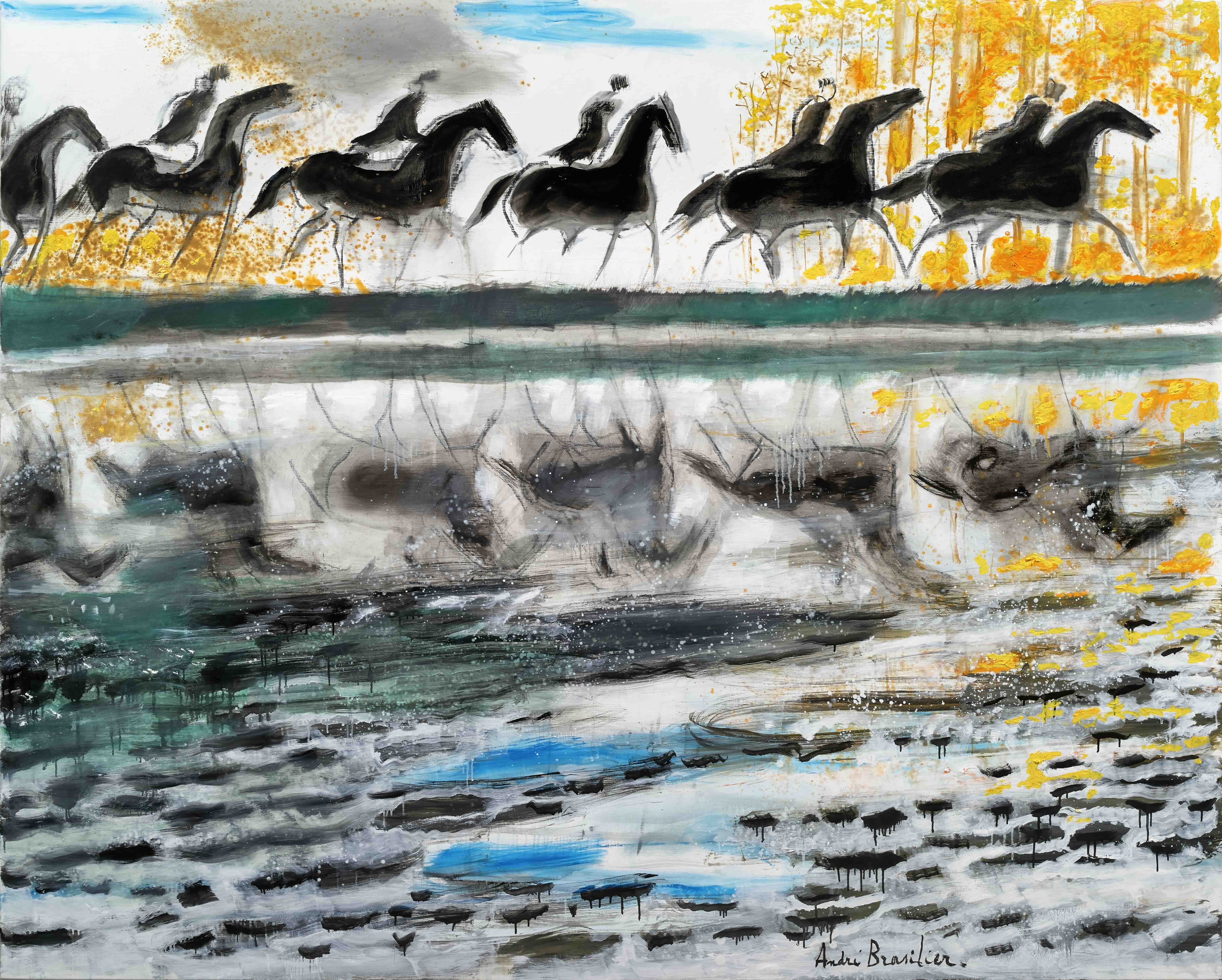 Blending abstraction and expressionism, André Brasilier's lyrical, dreamlike paintings explore an intimate communion with nature. Horses—described by Brasilier as "a superb creation...charged with symbolism, strength, dynamism and beauty"—feature prominently, their elegant forms cantering through serene seascapes, chilly winter woods and brilliant sunsets. The artist's wife and muse, Chantal, is also a favorite subject, often portrayed delicately arranging flowers.