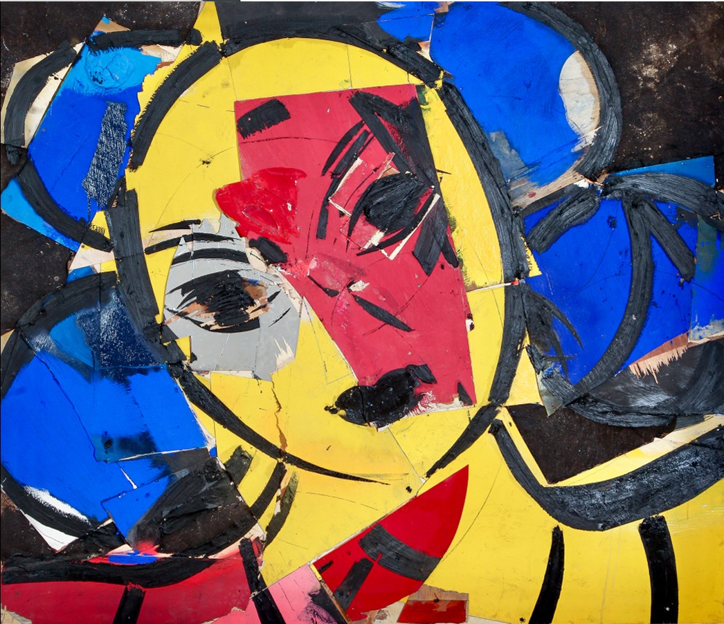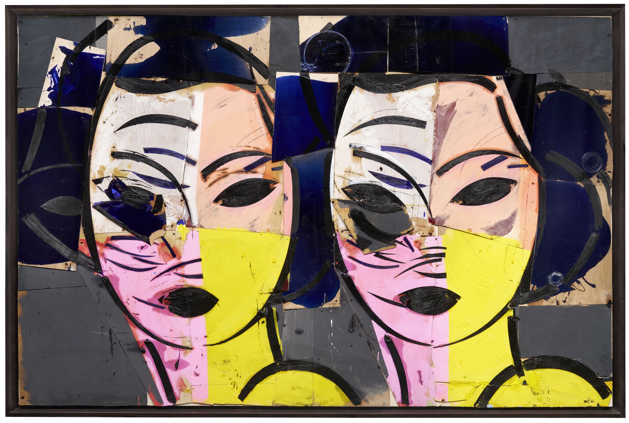 The exhibition traces how his recurring motifs evolve across time and media, showcasing his dialogue between tradition and innovation. Iconic Infanta Margarita sculptures—crafted from painted wood to aluminum—stand alongside textural portraits in burlap and oil on canvas, exemplifying Valdés’ distinctive exploration of form and material. Sculptural busts in Murano glass and bronze, such as Cabeza con formas geométricas (2023), reveal refined symmetry, while textural mixed-media portraits like Doble cara en rosa (2023) depict two ambiguous figures layered with contrasting hues and textures.