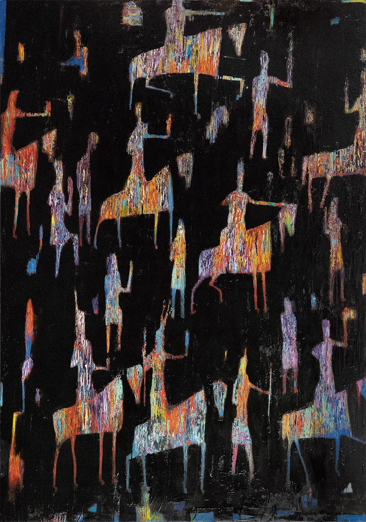 Reza Derakshani is painter, poet, musician and performance artist, born in Sangsar, Iran in 1952. He graduated from the University of Tehran in 1976 and pursued his studies at the Pasadena School of Art in California. He now lives and works between Dubai, UAE and Austin, USA.