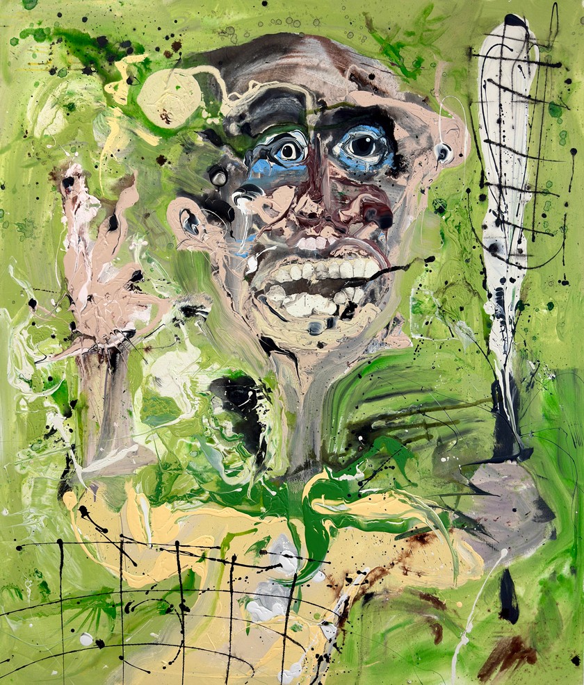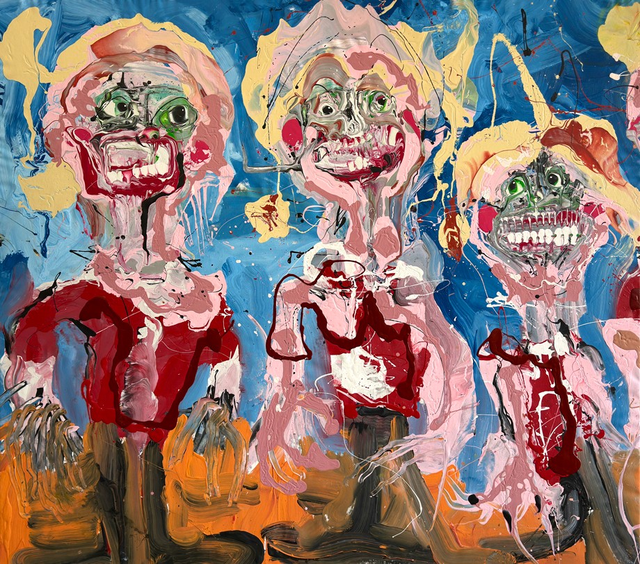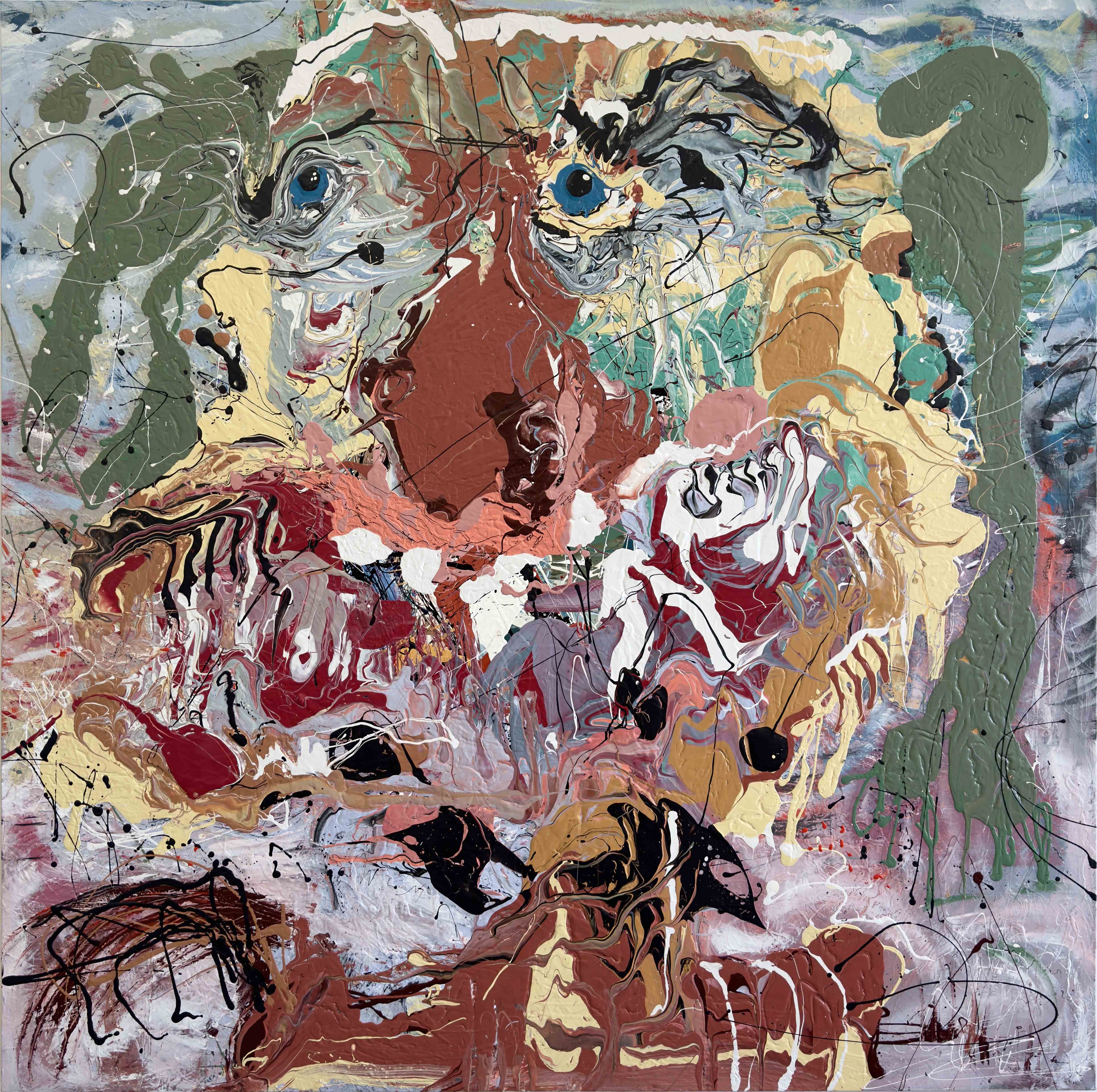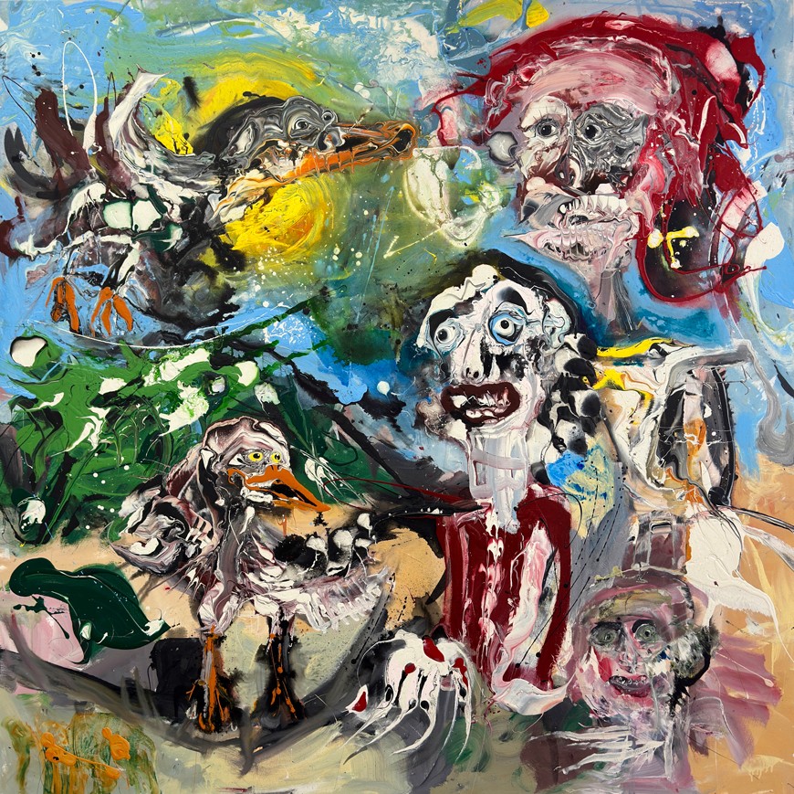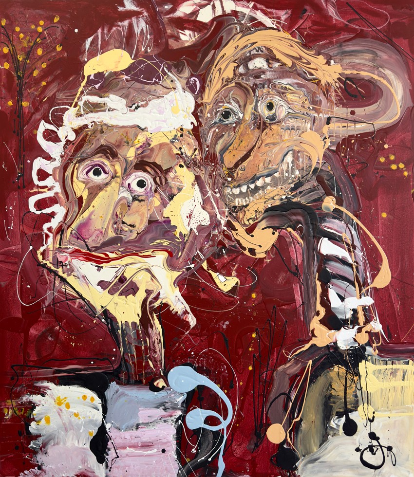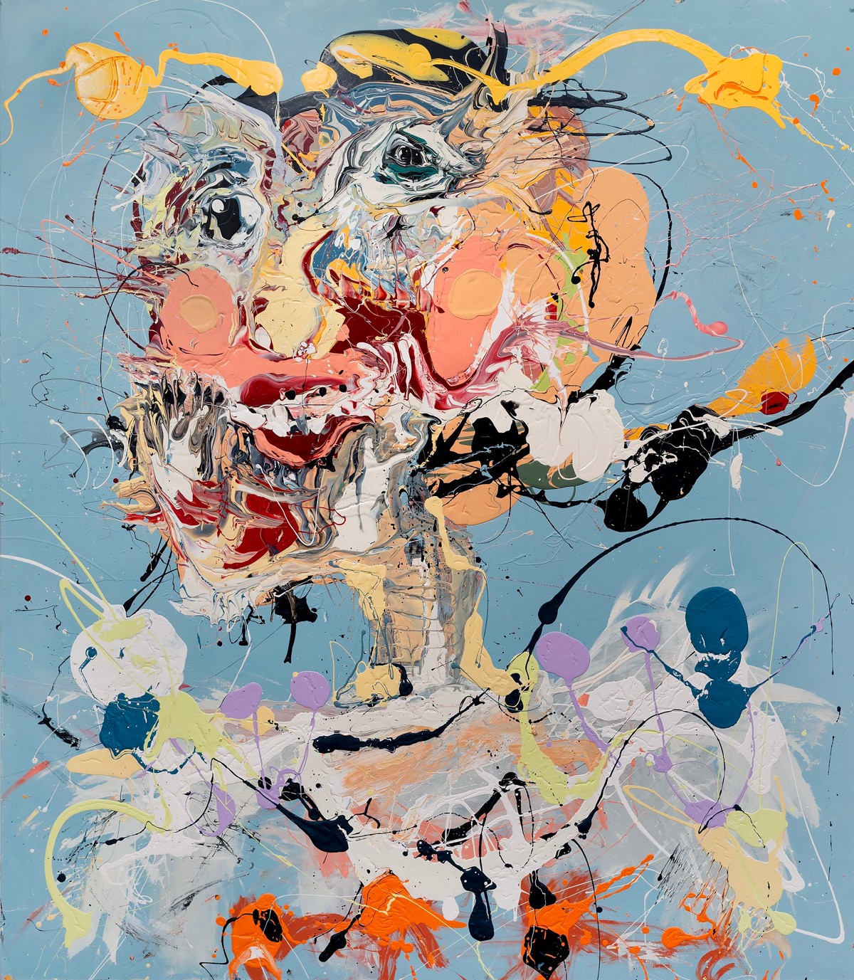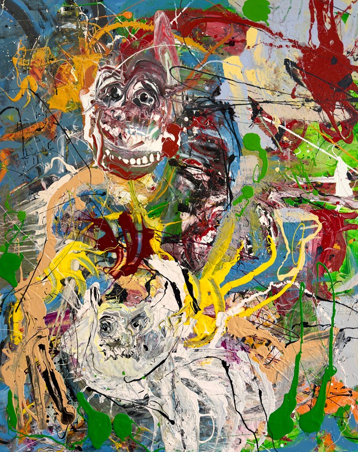 Many of Dillon’s paintings centre around pairs of eyes that emerge from chaotic storms of abstraction, revealing loosely-rendered characters around them. These are not human subjects, nor are they animals; they are the impossible-to-categorise products of the artist’s automatic painting process. He is interested in how the inclusion of eyes lend a kind of legibility to an image, bringing his abstractions a sense of relatability and the possibility of a two-way dialogue between painting and viewer.