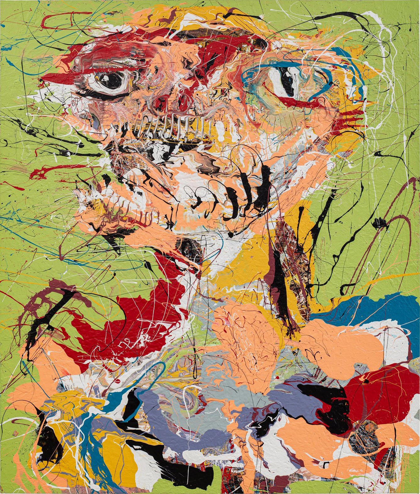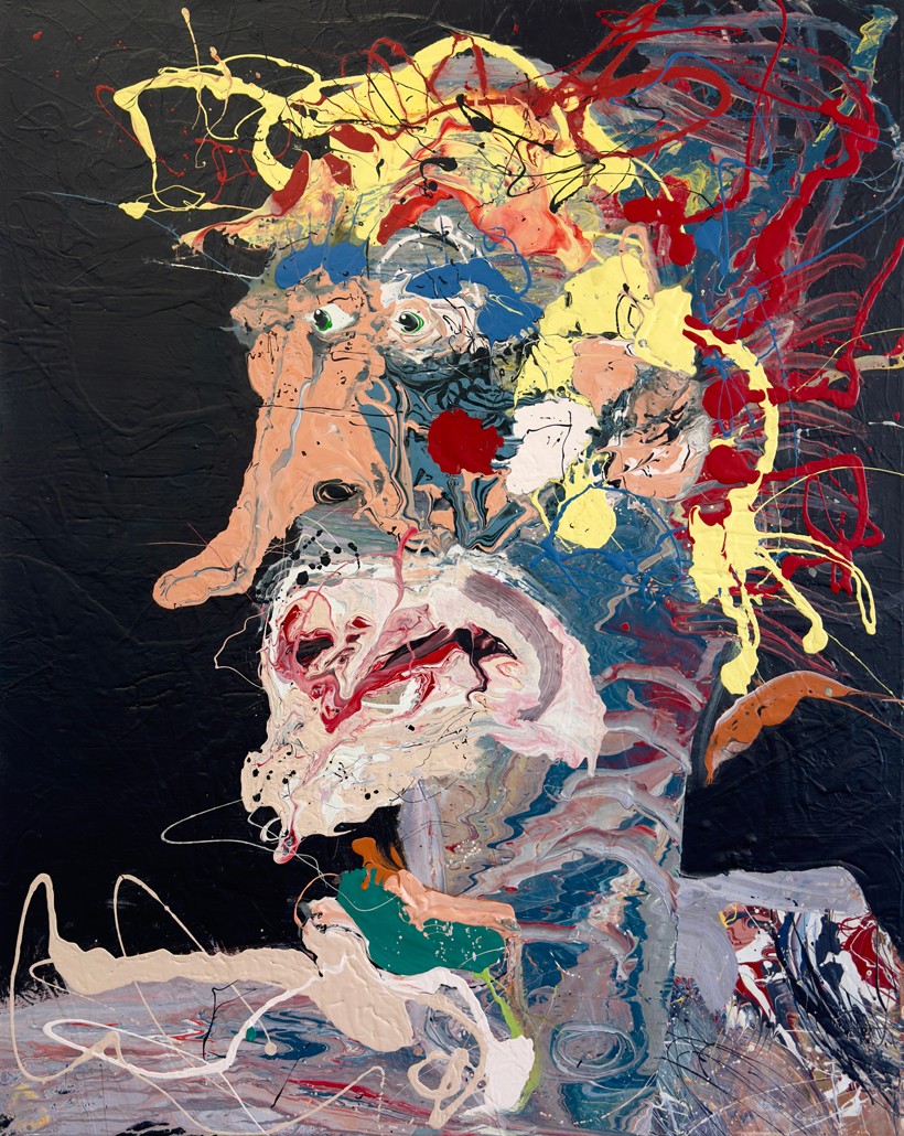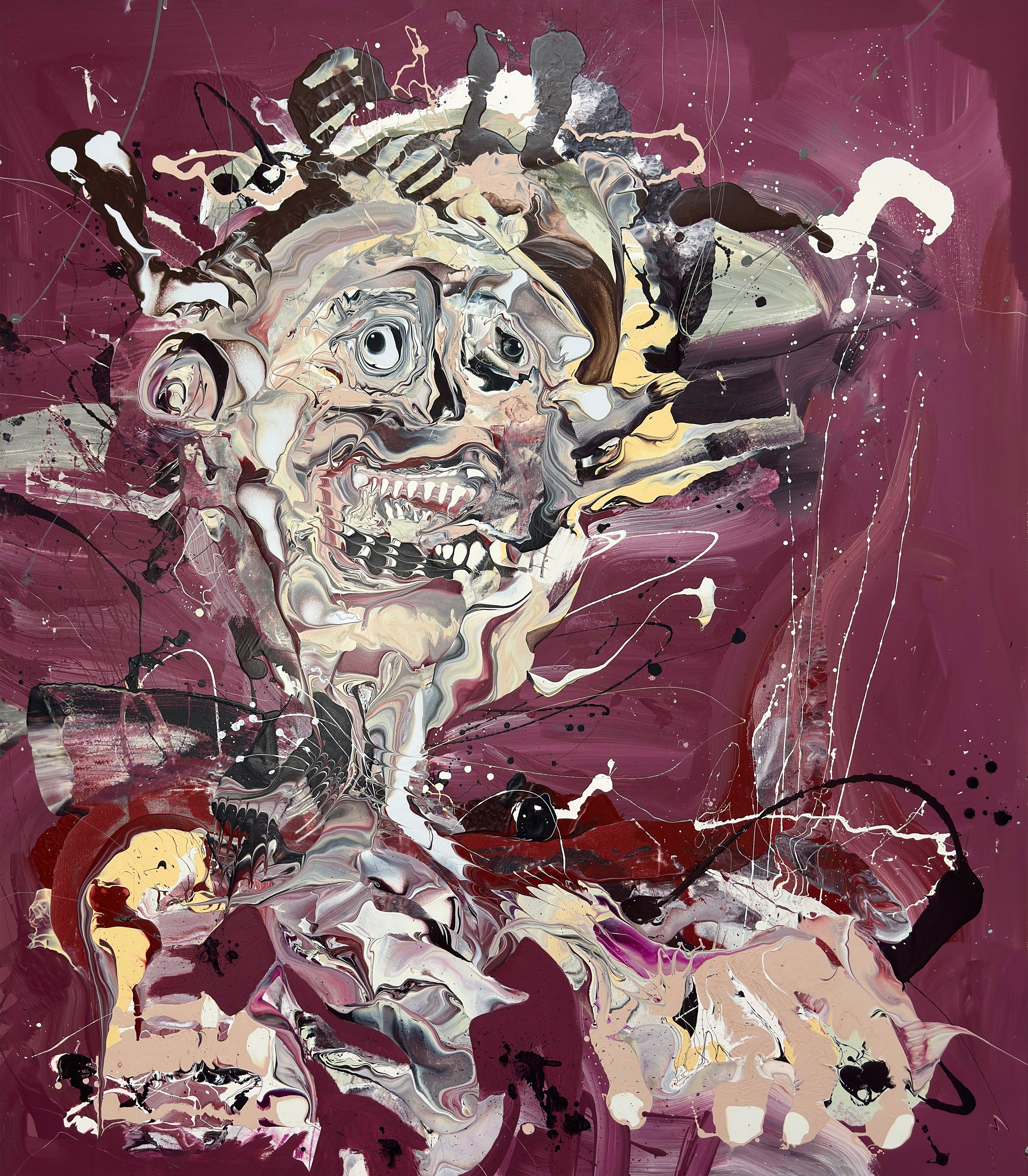 Dillon employs a unique painting process that begins with a ritual meditation involving incense, mantras, breathwork, and automatic movement before he enters the studio. The artist actively seeks to eradicate any sense of authorship from his work, positioning an intuitive creative impulse, rather than a conscious sense of intention, as the creative engine of his practice. For Dillon, this kind of passivity, which he describes as “denying the self”, leads to a primordial kind of painterly communication. He describes a two-way relationship between him and the image unfolding on the canvas; a creative push-and-pull where the tools of its creation — including his hands, squeegees, syringes, toothpicks and chopsticks — work in unison.